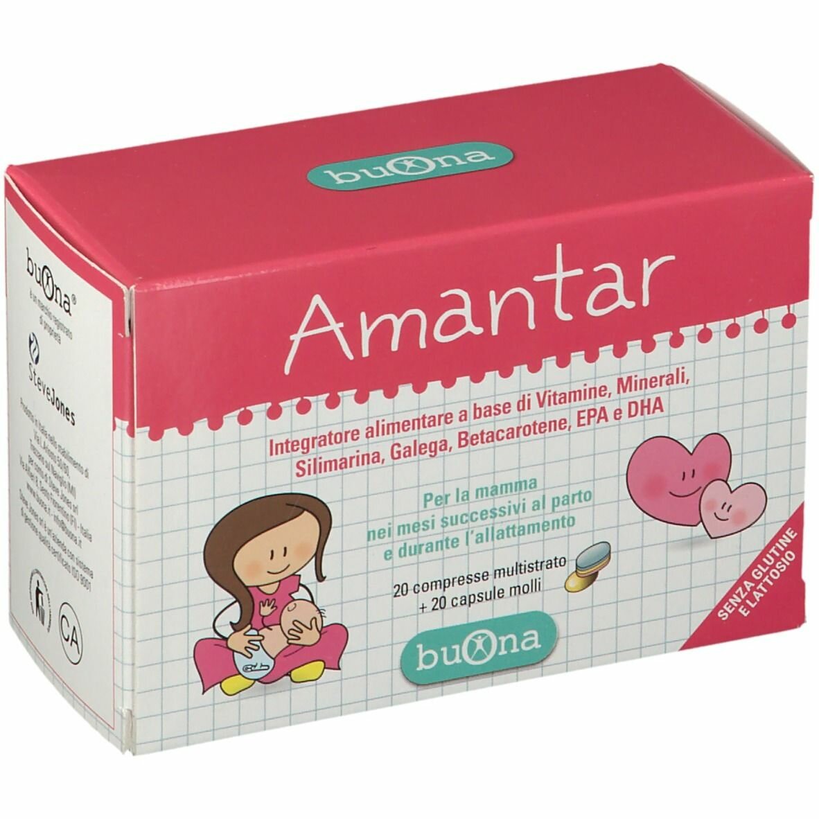 CONTATTACIAmantar 20 compresse da 1,6 g + 20 capsule da 0,637 g, prodotto da Buona spa societa’ benefit, è un integratore consigliato per favorisce lo sviluppo del feto/neonato e protegge la salute della mamma.