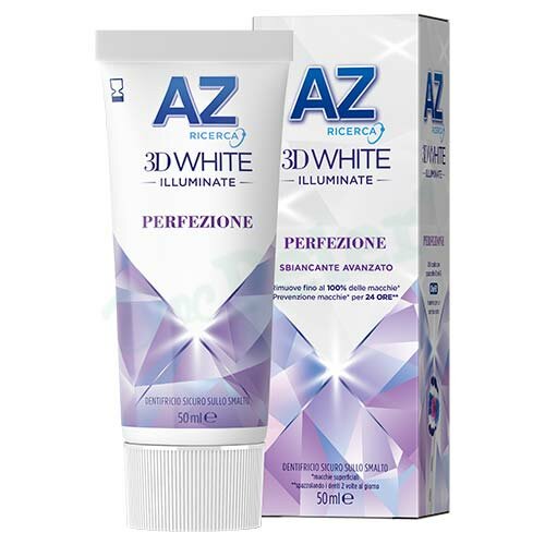 CONTATTACILa formula rivitalizzante del dentifricio AZ 3DWhite Illuminate Perfezione protegge attivamente dalle macchie superficiali per 24 ore, spazzolando i denti due volte al giorno. La sua schiuma penetra in profondità e rimuove attivamente fino al 100% delle macchie superficiali nelle aree difficili da raggiungere, mentre il fluoro nutre e rafforza lo smalto.
