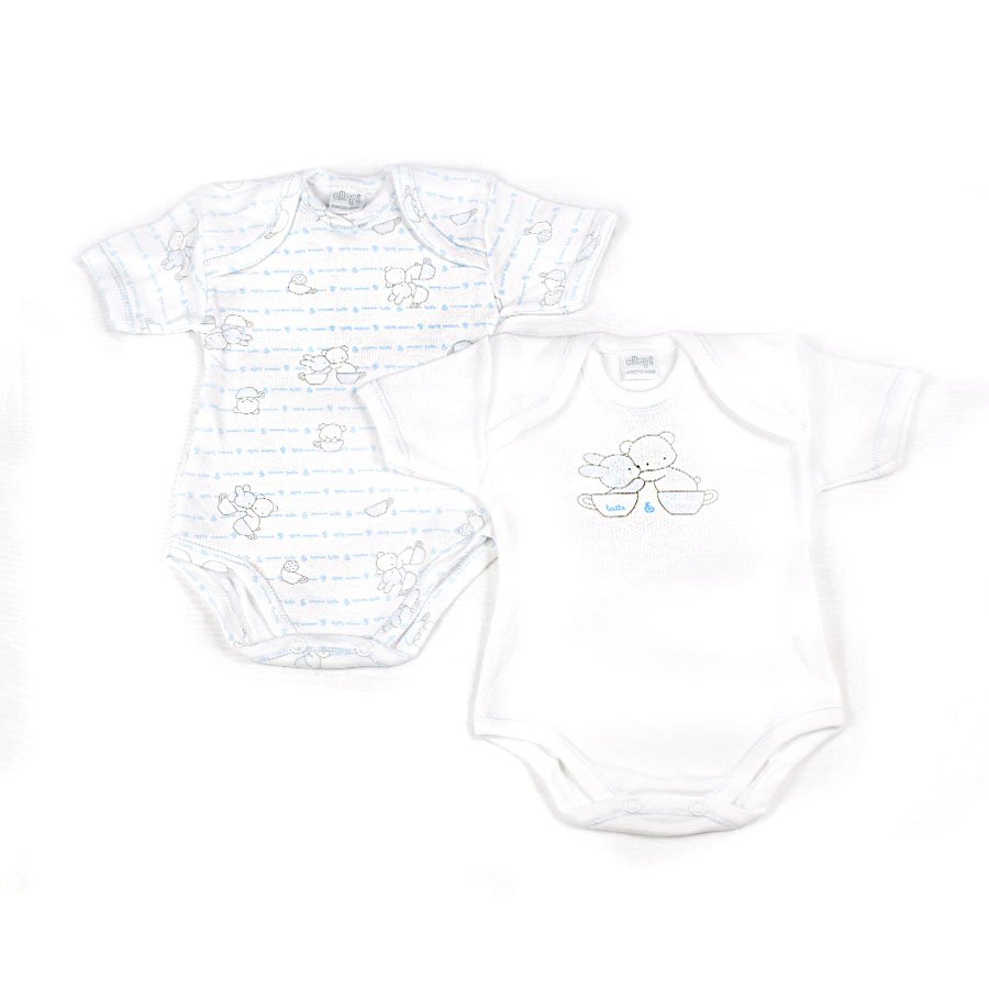 Questo set comprende 2 comodi Bodies da bambino in caldo cotone,in due fantasie. Uno è a fondo bianco, con al centro il disegno di un coniglietto, che spunta da una tazza con scritto latte, e bacia sulla guancia un orsetto, che esce da una tazza con scritto cacao. L’altro è a fondo bianco con la stampa della scritta latte e cacao ripetuta, e il disegno del coniglietto e dell’orsetto in piccolo, sui toni dell’azzurro.
