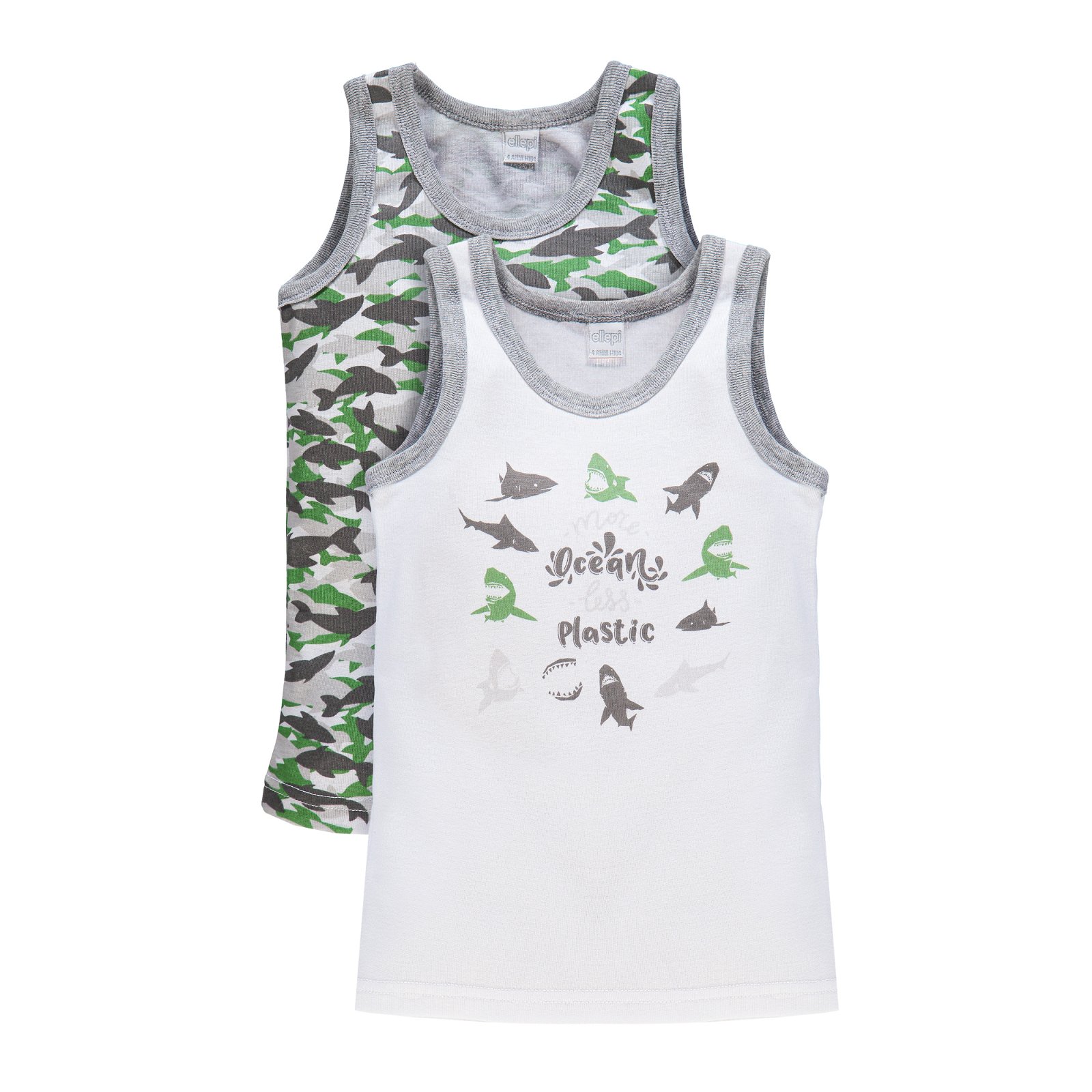 CONTATTACISet 2 canottiere a spalla largaUna canotta tinta unita bianca, stampa frontale a tema squali, e bordi grigi a contrastoSeconda canotta bordata in grigio, con fantasia allover con squali sui toni del grigio e dell’azzurroGirocolloQuesta linea di intimo è realizzata in costina di puro cotone. Morbida e confortevole, assicura un’ottima protezione senza irritare la pelle del tuo bambino.Ellepi, realizza dal 1966 collezioni di abbigliamento, accessori, intimo e pigiami per neonati e bambini. Prodotti pratici e funzionali, sicuri al contatto con le pelli più delicate. Ellepi, garanzia di qualità, stile, sicurezza e affidabilità: da oltre 50 anni l’intimo più amato dalle mamme.