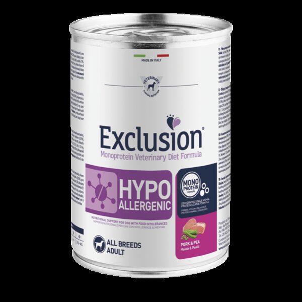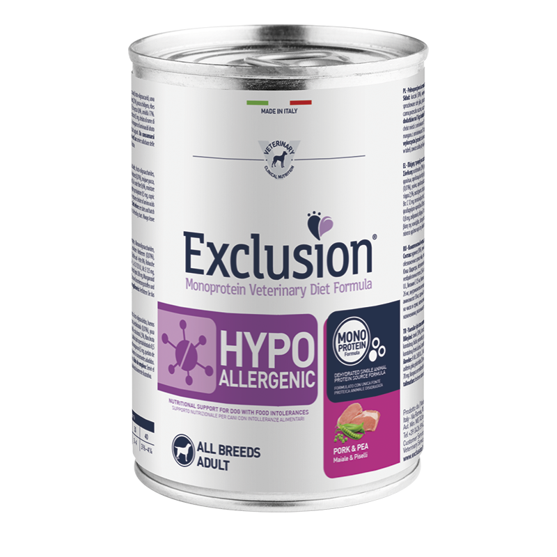 Exclusion Monoprotein Veterinary Diet Formula Hypoallergenic è un alimento dietetico con formulazione monoproteica, realizzato con un’unica fonte alternativa di proteine animali, ingredienti innovativi e preservato con tocoferoli naturali; rappresenta la risposta nutrizionale a disposizione del Veterinario, differenziata per taglia, come supporto nutrizionale per cani con intolleranze alimentari.