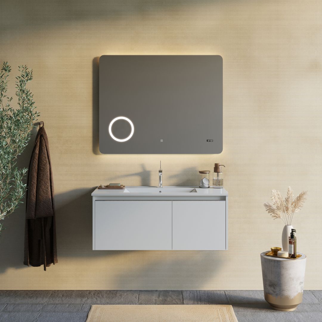 KVstore, esperto di arredo bagno presenta la nuova linea Monaco a cui appartiene questo mobile bagno sospeso da 100cm in bianco opaco con specchio touch led. Una soluzione d’arredo moderna, dalle linee pulite ed una finitura bianca estremamente versatile. La base è composta interamente in Mdf certificato Fsc con rivestimento in pvc, per una maggiore resistenza all’umidità. Il mobile dispone di un capiente cassetto ad estrazione totale ed un’anta non reversibile. Sul bordo superiore è presente un profilo a gola in metallo cromato che agevola l’apertura, mentre la chiusura è rallentata per evitare impatti rumorosi. Ai lati del cassetto sono collocate delle sponde metalliche che permettono di trattenere al meglio gli oggetti e di sfruttare il cassetto in tutta la sua capienza. Il lavabo è in ceramica con foro per il rubinetto ed il troppopieno. La composizione di completa con una specchiera con illuminazione a led integrata, specchietto ingranditore e orologio digitale.