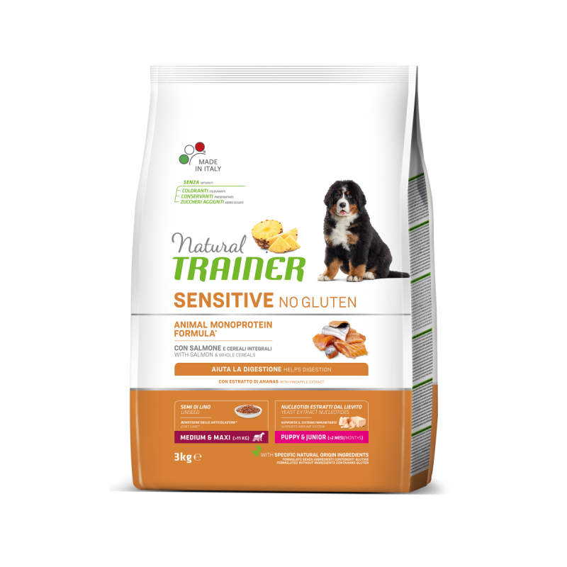 Natural Trainer Dog SENSITIVE Medium&Maxi è l’alimento perfetto SENZA GLUTINE CON CEREALI INTEGRALI per il tuo cucciolo.