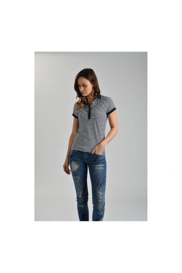 CONTATTACIPolo donna mezza manica rigata realizzata in jersey stretch, maniche costruite a kimono impreziosita da inserti intessuto a contrasto su colleto e canolo e applicazioni di perle sul davanti