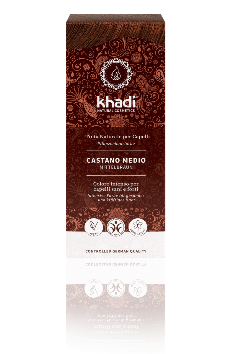 CONTATTACILa nuance Castano Medio khadi dona colore, volume e lucentezza ai tuoi capelli! Il risultato finale è unico, infatti dipende dal tuo colore naturale di partenza: può spaziare da un caldo e vivace castano cannella fino a un intenso castano medio . Dona riflessi caldi e nuova elasticità ai tuoi capelli! Gli ingredienti completamente vegetali dalle preziose proprietà donano ai capelli riflessi intensi e li nutrono in profondità. Le Tinte Naturali per Capelli khadi donano alla tua chioma durante la colorazione un colore intenso, uno straordinario volume e capelli sani e lucenti! Modo d’uso : Lava i capelli con uno shampoo senza siliconi , come per esempio lo Shampoo Ibisco khadi. Mescola la miscela della Tinta Naturale per Capelli khadi con acqua calda a una temperatura di 50 °C, fino a quando otterrai un composto dalla consistenza cremosa . Distribuisci il composto sui capelli in modo uniforme con un pennello: ciocca per ciocca fino alla punta. Se desideri tingere solo le radici, non applicare la tinta sulle lunghezze e sulle punte. Lascia agire la Tinta Naturale per Capelli Castano Medio per 30-120 minuti . Più la lascerai agire, più scura sarà la tonalità del colore finale. Se hai già utilizzato questa nuance per tingere i capelli e desideri solamente ravvivare il colore, lascia in posa la tinta per 15-30 minuti. Risciacqua la Tinta Naturale per Capelli khadi con acqua . Non utilizzare lo shampoo per 24-48 ore, questo è l’arco di tempo necessario per permettere ai pigmenti colorati di svilupparsi completamente. Trascorso questo arco di tempo, prima del lavaggio utilizza un Olio per Capelli khadi per fissare i pigmenti colorati sui capelli. Lascia agire l’olio per almeno 20 minuti e quindi lava i capelli con uno shampoo naturale, così la tua nuance khadi manterrà la sua brillantezza più a lungo. INCI: Indigofera tinctoria Leaf Powder*, Lawsonia inermis Leaf Powder*, Emblica officinalis (Amla) Fruit Powder*, Eclipta alba (Bhrigaraj) Whole Plant Powder*, Rheum Emodi Rhubarb (Rabarbaro) Root Powder, Ziziphus jujuba (Giuggiolo / Sidr) Leaf Powder*, Ziziphus spina-Christi (Giuggiola di Cristo) Leaf Powder*, Azadirachta indica (Neem) Leaf Powder*, Eucalyptus globulus (Eucalipto) Leaf Powder*, Aloe barbadensis (Aloe vera) Leaf Powder*, Matricharia chamomilla (Camomilla) Flower Powder* (*Ingredienti da coltivazione biologica controlla) Confezione da 100 grammi.