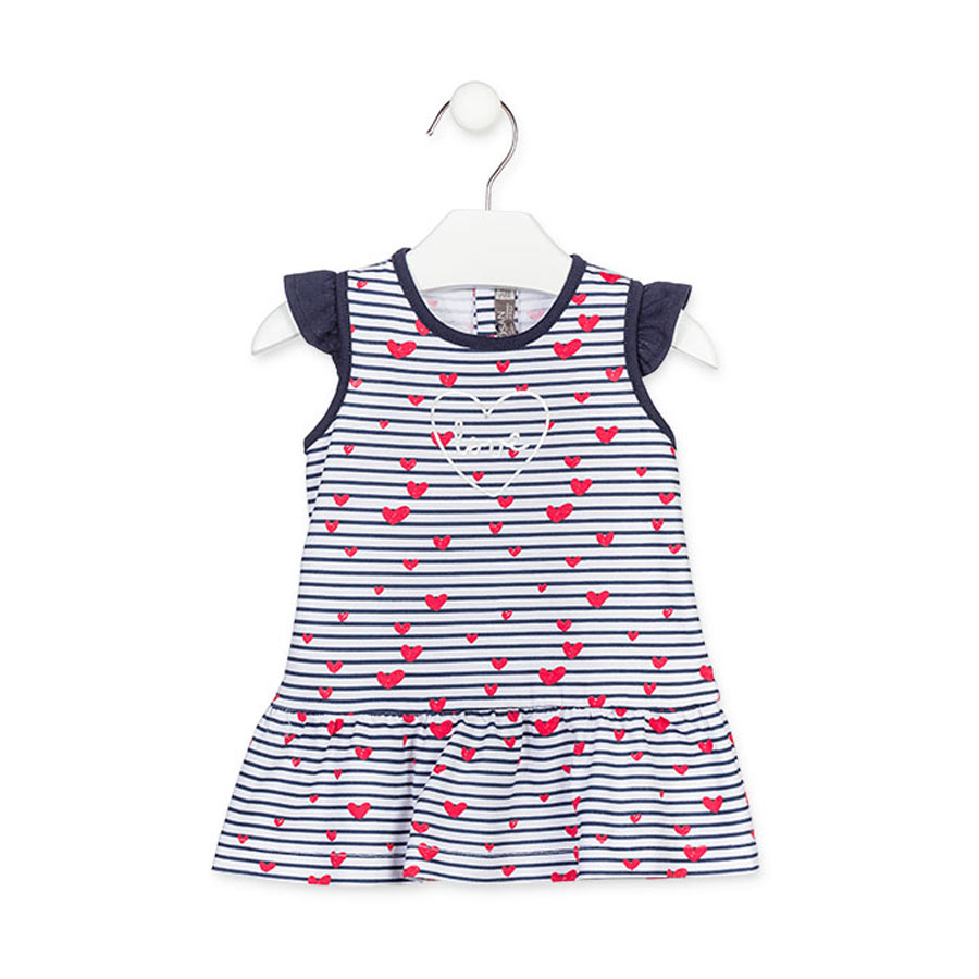 CONTATTACIVestito righe e cuori baby in jersey a righe stampate di colore blu per baby bambina. Vestito a spalline con volant. Cuori stampati di colore rosso. Elastico ai fianchi che crea volant nella gonna. Apertura posteriore con bottoni di plastica di colore blu.