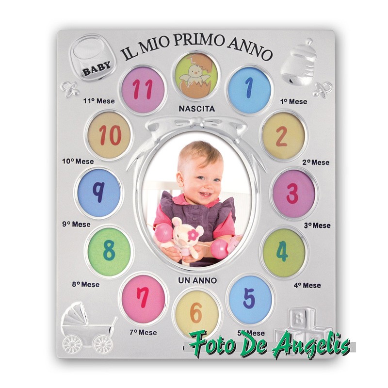 CONTATTACICornice Nascita in metallo, colore argento, finitura opaca e lucida, decoro in 3D a tema neonato, con scritta IL MIO PRIMO ANNO, multifoto da tavolo, per 13 foto, con retro in velluto, ideale per celebrare la nascita, adatta ad un bambino/a, a tema baby. Misure foto :1x10x13 12x4x5